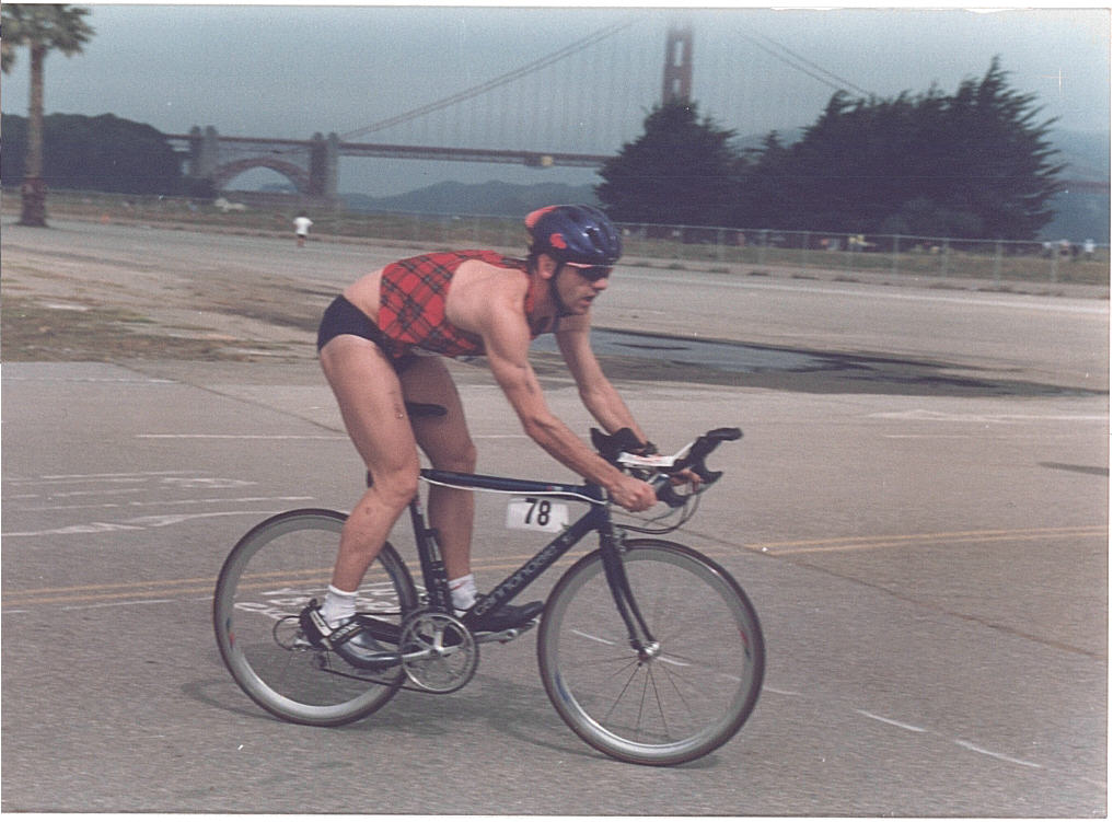 Race day, Sunday 31st May, up at 5 am, breakfast of energy bars and carbohydrate gels (yuk!). Take bike and kit to transition area, then a bus back to the pier to board the ferry boat. At 7:30am, with all 700 of us aboard, including some of the top professional triathletes in the world, we headed out into the Bay. The captain welcomed us aboard ‘The Hornblower’ and said that he’d dispense with the usual safety briefing as we’d all be jumping overboard in twenty minutes, anyway! After singing the [American] national anthem, led by an off-key volunteer, we jumped the estimated 4 feet overboard, three at a time, into the 56 degree (F), cool [if you were from Scotland, icy if you were from Texas] waters of the Bay. I settled into a rhythm after a few minutes, for the tough 1½ mile swim from the infamous Island to the St. Francis Yacht Club, heading all the time, as instructed, for the shore, striving to cross the 2 knot rip which sweeps you West under the Bridge and onto Hawaii! No sign of sharks, though, only fellow wetsuited athletes and a few real men in the flesh. Encouraged by the race director to do so at this point, I tried to pause (glug, cough, splutter!) halfway through the swim to take in the incredible view of my surroundings (he was obviously a proficient swimmer, though, unlike me!). I swam steadily and with the Golden Gate Bridge close by on my right, thankfully exited the water (tired) in 37 mins, and, as I stumbled along, starting to peel off my wetsuit, I realised I’d made it, I’d escaped from Alcatraz !