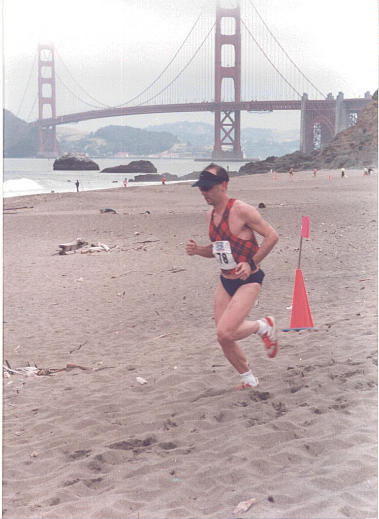 As I ran the short ½ mile from the swim finish to the bike transition (resplendent, wearing my tartan vest and speedos !), I had no idea that I was about halfway down the field of 700, a better result than usual for my weakest discipline. Helmet and obligatory shades on and out on the bike course next, and it was crowded, I was weaving past people in groups of 3 and 4 as I tried to surge ahead over the 18 undulating (!) miles, past the Golden Gate Bridge, out and back through the Presidio Headlands, along the shore at the Great Highway and through the Golden Gate Park. The awesome views were only a momentary distraction from the pain of the steep climbs, as were the television helicopters hovering above. I was sure I’d moved up the field, though I’d no idea at that time that I’d passed over 200 competitors! A slow bike time of around 57 mins for the 18 miles revealed how tough it had been.