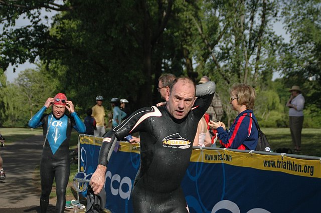 I already had my foot taped but wasn’t expecting it to stay like that during the swim…sure enough, after an hour the tape was flapping around my foot. I had visions of some interesting aquatic carnivore becoming attracted to the tape bait and after a few minutes of that, I somehow slowed to a halt (some would say they didn’t notice any change in my speed..) and detaped my foot. I knew I wasn’t swimming particularly well and there was no-one around. I was getting tired. I exited in 1:37:51 second last in my age group.