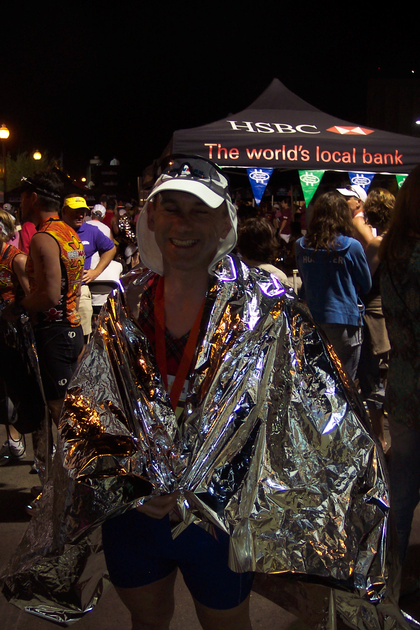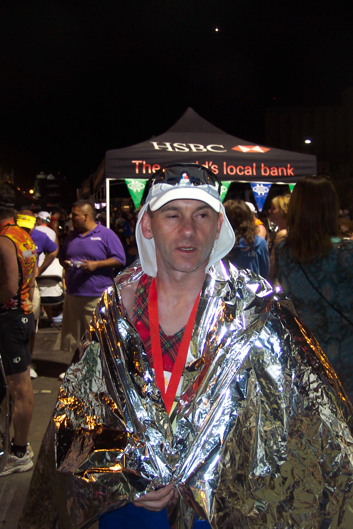 One of my friends, Seton Claggett (a super fast sub 10 hour Ironman) and owner of Tri Sports has the rocking’est aid station – definitely the best support on the run…how difficult it was to spot him with that wireless microphone lol. I see his wife Debbie on one lap as I pass through, I shout hello, she doesn’t really need to recognise me – she knows there is only one guy in this race with THAT Scottish accent! Last lap as the temperature cools down to 25 degrees C and I can actually start to run a little – Seton again acknowledges my efforts – I smile, as he knows that I’m not made for this kinda heat. As I traverse under the Ford mist cooler, it causes my body to retch uncontrollably – apparently it does cool you down but it is too much for my frail condition. Walking walking walking.